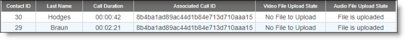 The recording associated with contact 29 has a duration of 00:02:21, which is the entire length of time that Agent Braun was connected to the customer. The recording associated with contact 30 has a duration of 00:00:42, which is only the length of time that Agent Hodges was consulting with Agent Braun.