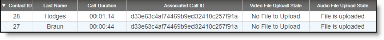 Calabrio ONE segments this contact into two contacts, 27 and 28. The recording for contact 27 has a duration of 00:00:44, which is the length of time that Agent Braun was connected to the customer before he transferred the contact to Agent Hodges. The recording for contact 28 has a duration of 00:01:14, which is the length of time that Agent Hodges was connected to the customer before the contact ended.